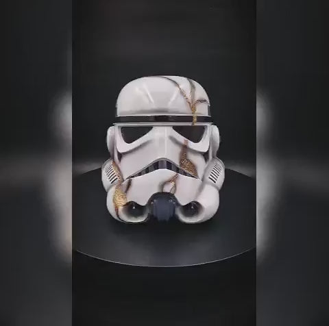 Deze Night Trooper helm is gebaseerd op de angstaanjagende soldaten van Grand Admiral Thrawn uit de serie Ahsoka. De helm combineert het klassieke Stormtrooper-design met duistere magie en een opvallende gouden afwerking die doet denken aan kintsugi – de Japanse kunst van het herstellen met goud.
