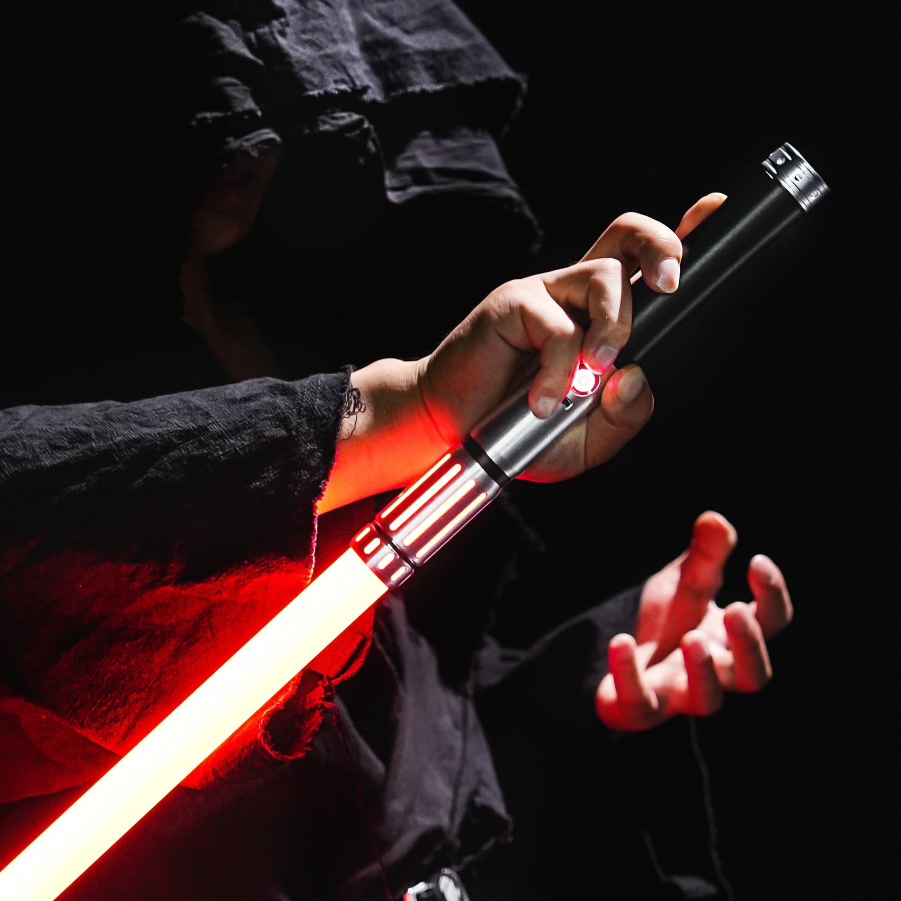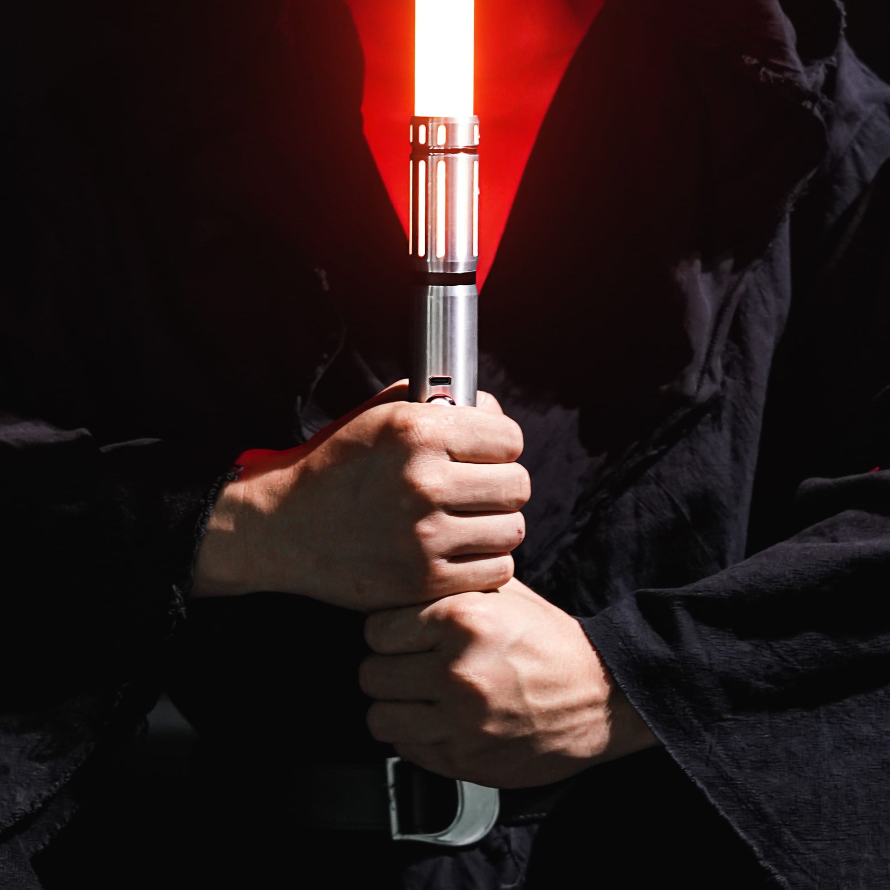 De lange emitter aan de bovenzijde van de saber zorgt voor een diepe zwaardligging, waardoor deze uitermate geschikt is om hard mee te duelleren. Wat de Uno echt bijzonder maakt, is de emitter. Het bovenste deel is voorzien van korte verticale emitter windows met een zwarte visuele scheidingslijn. Daaronder vind je een reeks diepe, langwerpige emitter windows die door hun lengte en aantal zorgen voor een indrukwekkend lichteffect. Het licht stroomt als het ware visueel door de hilt en vormt daarmee het absolute hoogtepunt van de saber. Afhankelijk van de kleur die je kiest – Jedi-blauw, Sith-rood of alles daartussenin – verandert de complete uitstraling van de saber. Juist daardoor is de Uno perfect voor iedere stijl en gebruiker: krachtig, elegant én veelzijdig.