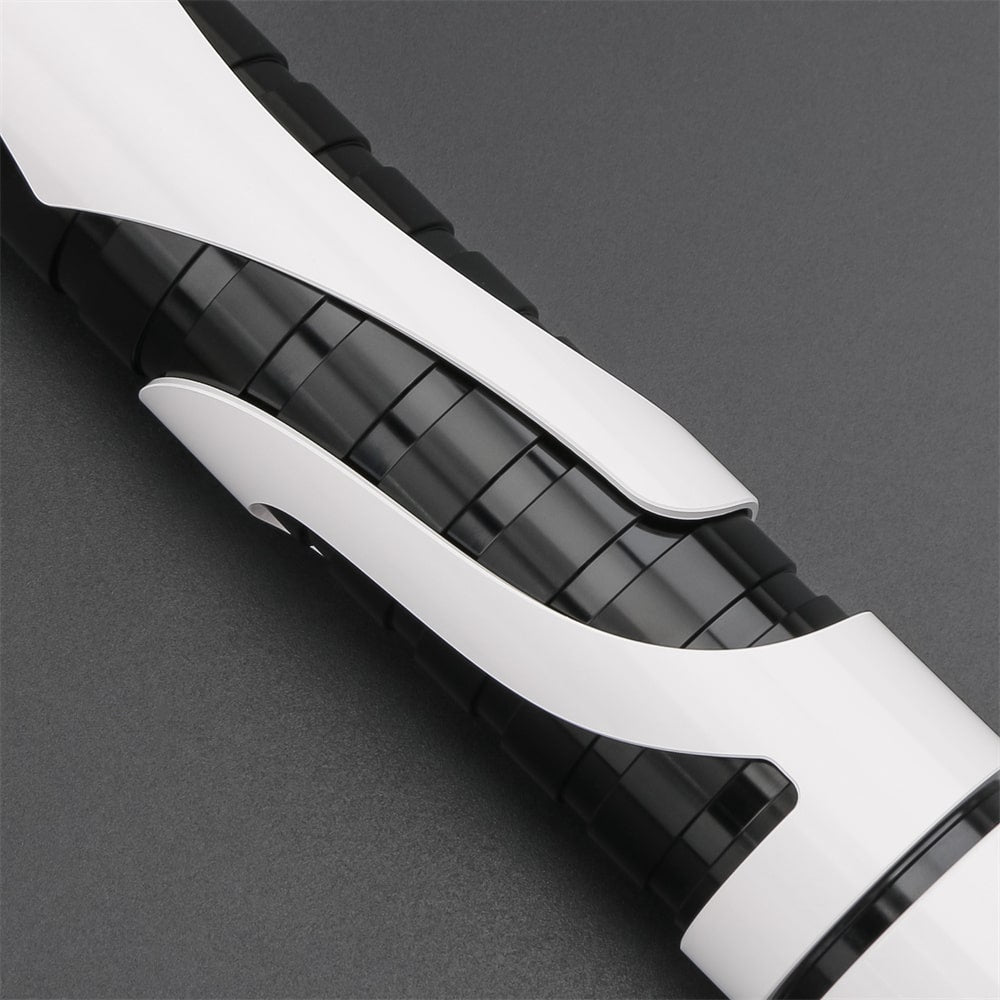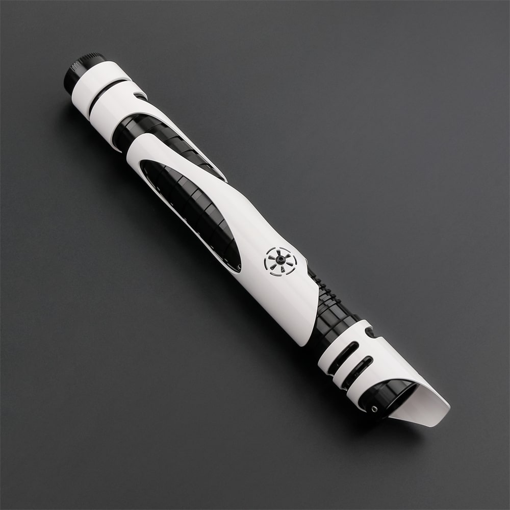 Beschrijving: De Kyber Guard valt meteen op door zijn zwart witte uiterlijk en het zichtbare kyber crystal. De basis van deze stevige aluminium saber is volledig zwart voorzien van dikke groeven in het handvat. Rondom is de saber voorzien van witte beplating. Het opvallende lichtgevende kyber crystal bevind zich in een sierlijke goudkleurige houder. Kyber Guard word bediend door middel van een knop, de oplaadpoort is weggewerkt en bevind zich aan de binnenzijde van de saber. Dit geeft de saber een sierlijk en stoer uiterlijk tegelijk.