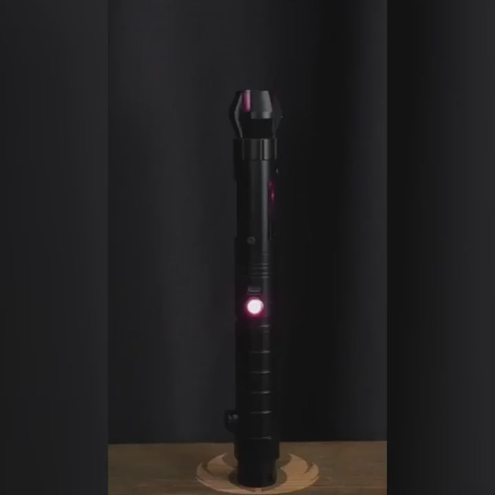 Beschrijving: Het handvat van de Kyberfighter is gemaakt van stevig zwart aluminium. Vlak onder de emitter bevind zich het het hoogte punt van deze light saber, namelijk : het Kyber Crystal. Deze contrasteert erg mooi tegen het zwarte aluminium. De emitter is voorzien van vier inkepingen voor extra lichteffect. De lightsaber ligt soepel in de hand is ideaal voor cosplay en duelleren. Maar ook perfect om als trofee ten toon te stellen in huis!