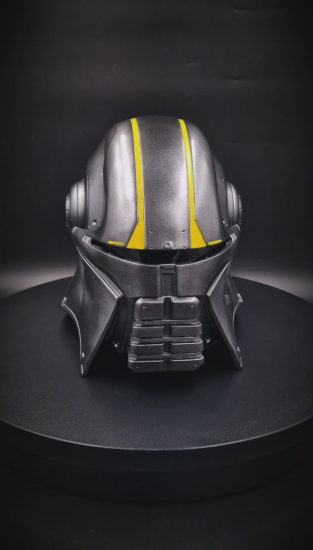 De helm is gemaakt van stevig resin met een metallic afwerking, voorzien van scherpe lijnen, geaccentueerde details en herkenbare gele striping op het vizier. Het ontwerp is strak, agressief en gemaakt om indruk te maken – of je nu kiest voor cosplay, display of beide.